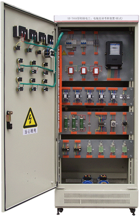 初級(jí)電工電拖實(shí)訓(xùn)考核裝置,初級(jí)電工考核柜,初級(jí)電工實(shí)訓(xùn)考核裝置是按照勞動(dòng)社會(huì)保障部頒發(fā)的“工人技術(shù)等級(jí)標(biāo)準(zhǔn)”和“職業(yè)技能鑒定規(guī)范”的內(nèi)容要求,根據(jù)初級(jí)電工培訓(xùn)考核的實(shí)際情況而設(shè)計(jì)的新一代集培訓(xùn)學(xué)習(xí)、理論驗(yàn)證、實(shí)際操作能力、考核鑒定于一體的多功能柜式設(shè)備。整臺(tái)設(shè)備以標(biāo)準(zhǔn)的電氣控制柜為主柜,利用柜體的雙面空間,布置電器 及配套實(shí)驗(yàn)器材,能完成初級(jí)電工考核鑒定中的電力拖動(dòng)控制與照明電路的實(shí)操項(xiàng)目,該電工、電拖實(shí)訓(xùn)考核裝置堅(jiān)持理論聯(lián)系實(shí)際的原則,突出技能訓(xùn)練,注重針對(duì)性、實(shí)用性、科學(xué)性,經(jīng)全國(guó)多家職業(yè)技能訓(xùn)練中心、職校、技校使用證明,該柜體設(shè)計(jì)合理、實(shí)操方便,占地面積少。為延長(zhǎng)電器的使用壽命,各電器的接點(diǎn)都與接線端子相連,再讓學(xué)生在接線端子上接線,連接電機(jī)、電器來(lái)完成各項(xiàng)控制實(shí)驗(yàn),有效降低材料消耗,延長(zhǎng)使用壽命。該套設(shè)備適用于各勞動(dòng)職業(yè)技能鑒定部門,同時(shí)適應(yīng)各大、中專、技校、職校初級(jí)電工、電拖專業(yè)教學(xué)與實(shí)訓(xùn)考核。
