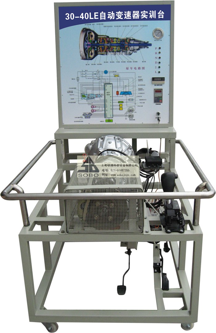 本變速器實(shí)訓(xùn)臺是本公司采用豐田后驅(qū)A340E自動(dòng)變速器為適應(yīng)汽車教學(xué)需求而研制的,該實(shí)訓(xùn)臺由電控變速器(八成新)、操作顯示面板及發(fā)動(dòng)機(jī)彩色電氣原理圖電腦控制柜、可移動(dòng)式臺架(萬向腳輪)、驅(qū)動(dòng)系統(tǒng)(腳踏式油門踏板)變頻電機(jī)驅(qū)動(dòng)、啟動(dòng)系統(tǒng)(電門鎖方式啟動(dòng))、車速傳感器、電磁閥執(zhí)行器、原車電腦、具有發(fā)動(dòng)機(jī)運(yùn)轉(zhuǎn)及顯示(轉(zhuǎn)速.車速.檔位)、液壓油壓力顯示表(顯示換檔過程油壓)、自動(dòng)變速器電磁閥工作指示LED燈、故障設(shè)置區(qū)可設(shè)置12路故障(老師設(shè)置任一路線路故障)、故障排除區(qū)(學(xué)生通過各種儀器、儀表、)在面板上用專用排故線連接排除故障、傳感器信號模擬等多項(xiàng)功能、具結(jié)構(gòu)緊湊、操作方便、安全可靠、教學(xué)直觀、是汽車自動(dòng)變速器實(shí)物教學(xué)不可缺少的實(shí)驗(yàn)室設(shè)備之一。
