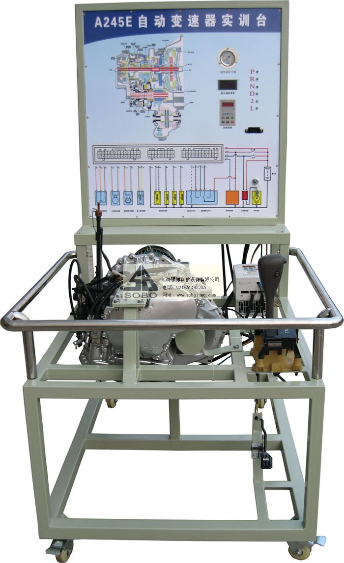 本變速器實訓臺是本公司采用一汽豐田自花冠動變速器為適應汽車教學需求而研制的,該實訓臺由電控變速器(八成新)、操作顯示面板及發(fā)動機彩色電氣原理圖電腦控制柜、可移動式臺架(萬向腳輪)、驅動系統(tǒng)(腳踏式油門踏板)變頻電機驅動、剎車系統(tǒng)(腳踏液壓盤試剎車)、啟動系統(tǒng)(電門鎖方式啟動)、車速傳感器、電磁閥執(zhí)行器、原車電腦、具有發(fā)動機運轉及顯示(轉速.車速.檔位)、液壓油壓力顯示表(顯示換檔過程油壓)、自動變速器電磁閥工作指示LED燈、原車OBD-Ⅱ診斷座、故障設置區(qū)可設置12路故障(老師設置任一路線路故障)、故障排除區(qū)(學生通過各種儀器、儀表、)在面板上用專用排故線連接排除故障、傳感器信號模擬等多項功能、具結構緊湊、操作方便、安全可靠、教學直觀、是汽車自動變速器實物教學不可缺少的實驗室設備之一。