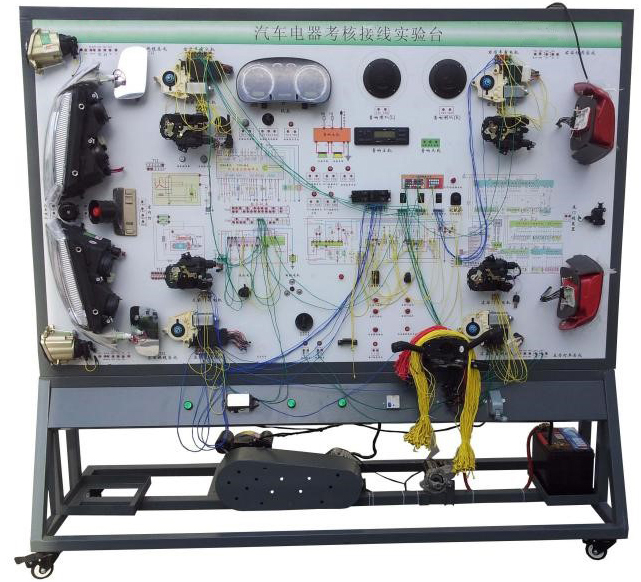 3.設備面板采用耐創(chuàng)擊、耐污染、防火、防潮的高級鋁塑板,表面經特殊工藝噴涂底漆處理;面板打印有永不褪色的彩色電路圖;學員可直觀對照電路圖和實物,認識和分析汽車整車電器各系統的工作原理。