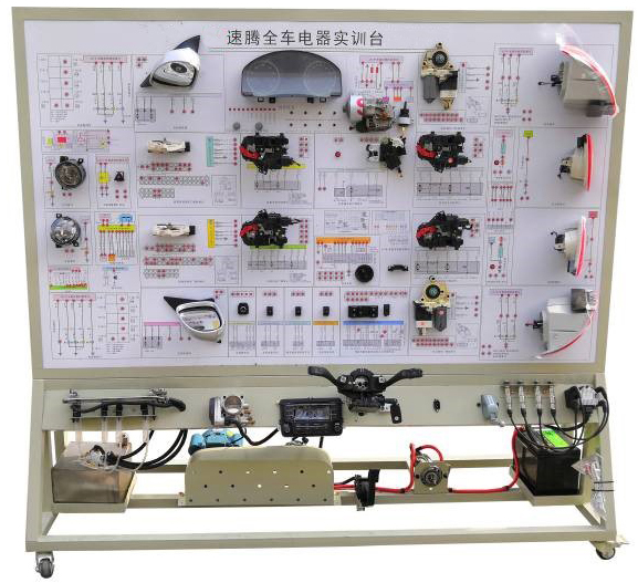 該設(shè)備采用 全新 大眾速騰1.6L 整車電器實(shí)物為基礎(chǔ),充分展示汽車發(fā)動機(jī)防盜系統(tǒng)、儀表系統(tǒng)、燈光系統(tǒng)、雨刮系統(tǒng)、喇叭系統(tǒng)、點(diǎn)火系統(tǒng)、電動車窗系統(tǒng)、電動門鎖、音響系統(tǒng)、起動系統(tǒng)和充電系統(tǒng)等汽車電器各系統(tǒng)的組成結(jié)構(gòu)和工作過程。